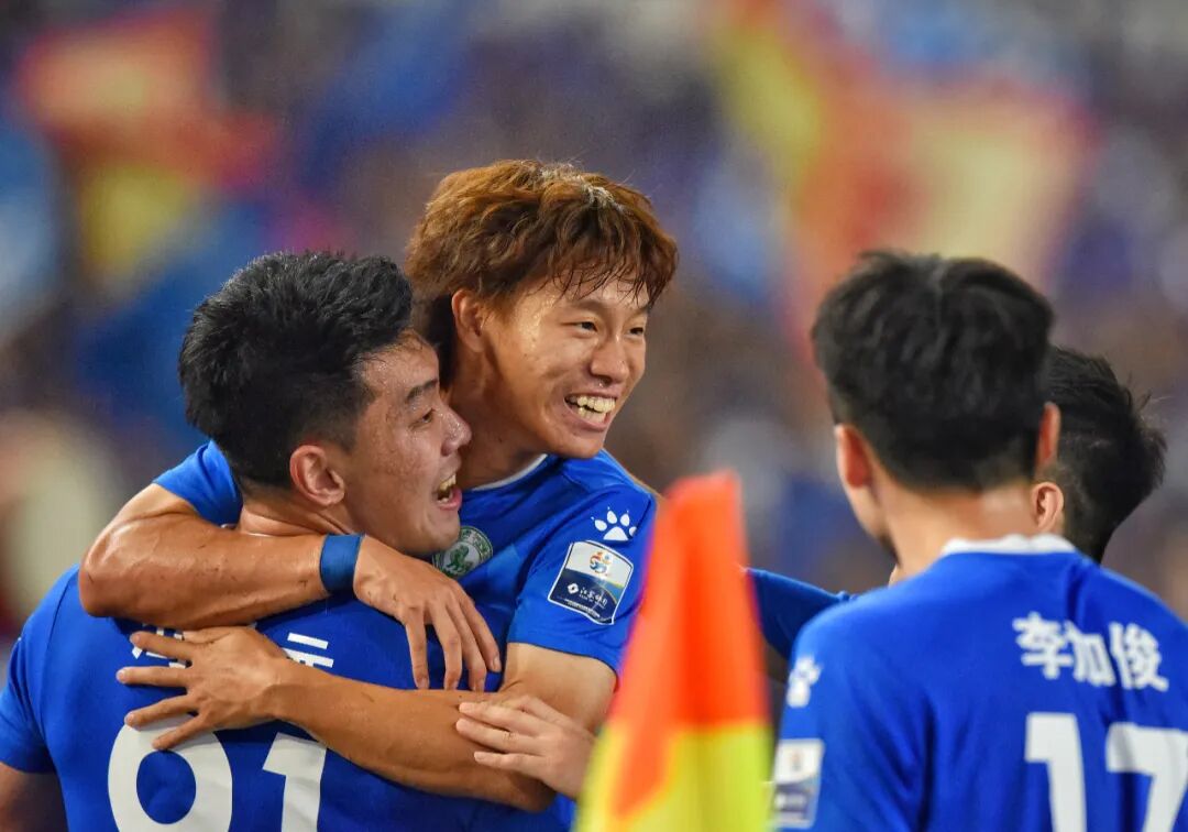 进球后的南京队24号球员司俊琰(左二)与队友相拥而庆。姚强 摄