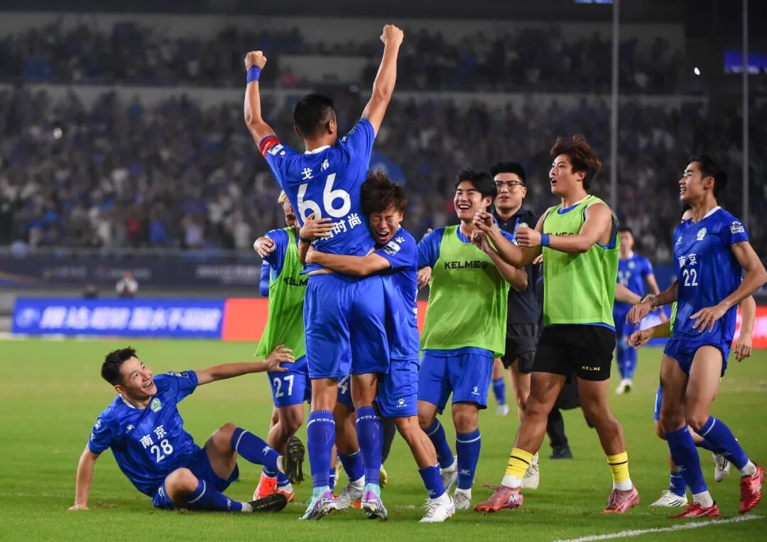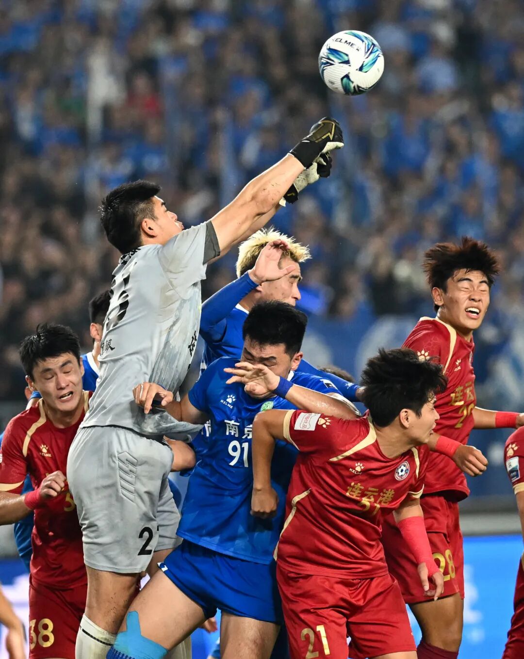 10月4日,“苏超”四分之一决赛上演,南京队坐镇主场对阵连云港队。经过点球大战,南京队以5比3击败连云港队,晋级“苏超”四强。冯芃 摄