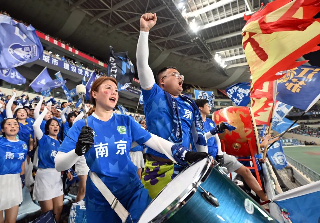 10月4日,南京奥体中心南门,“苏超”淘汰赛八进四南京队对阵连云港队比赛前,南京球迷协会欢迎连云港球迷现场。刘明 摄
