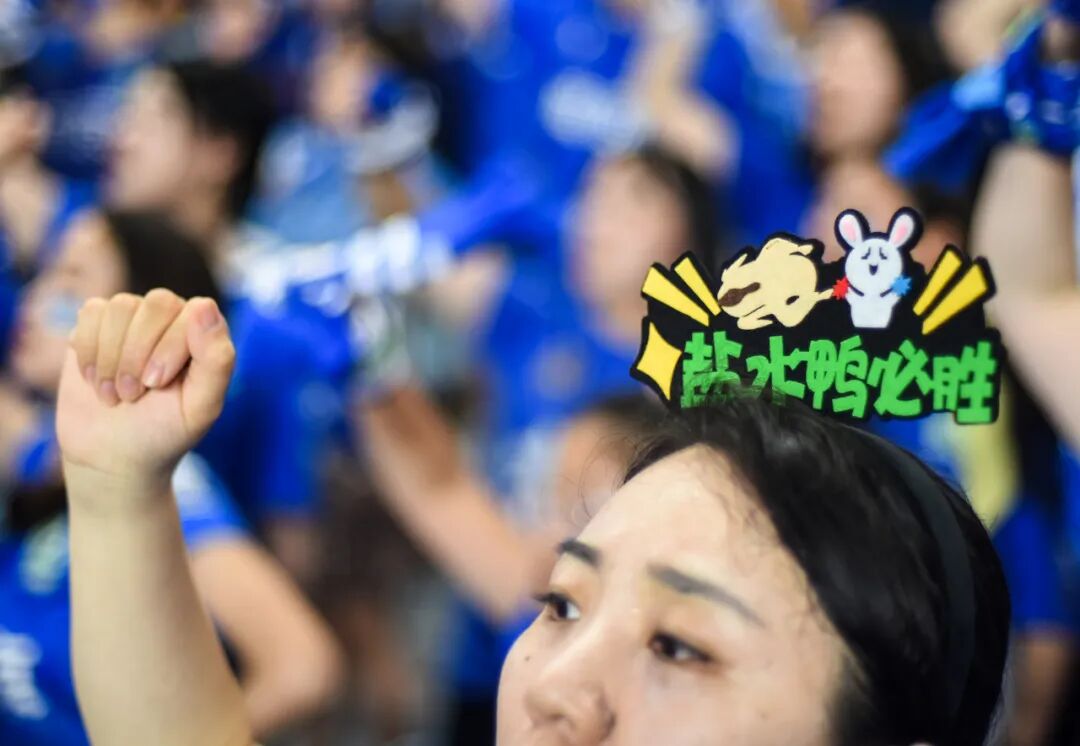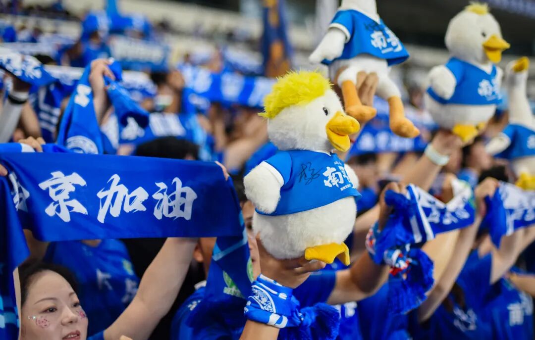 南京队球迷带着吉祥物为球队加油。余萍 摄