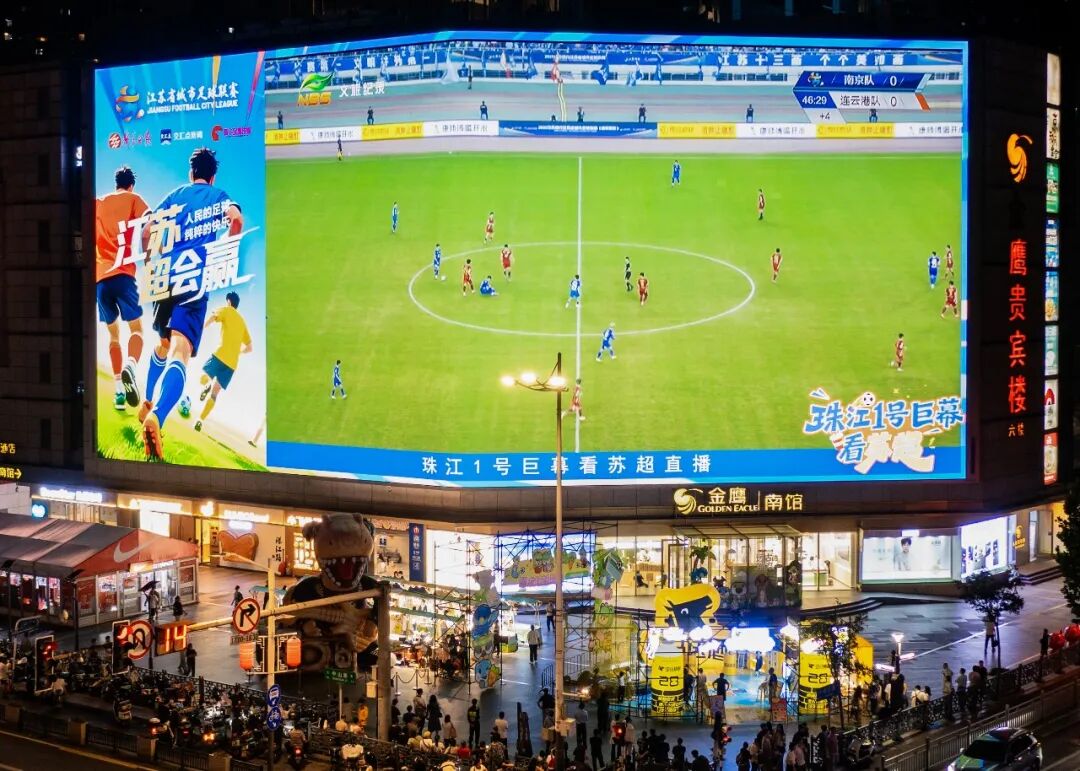 10月4日晚,南京市区众多商场、户外广场利用室内外大屏进行赛事直播,开启观赛“第二现场”,方便市民、球迷“全域”观赛,享受“苏超”比赛带来的快乐。图为珠江路路口金鹰户外大屏。苏阳 摄