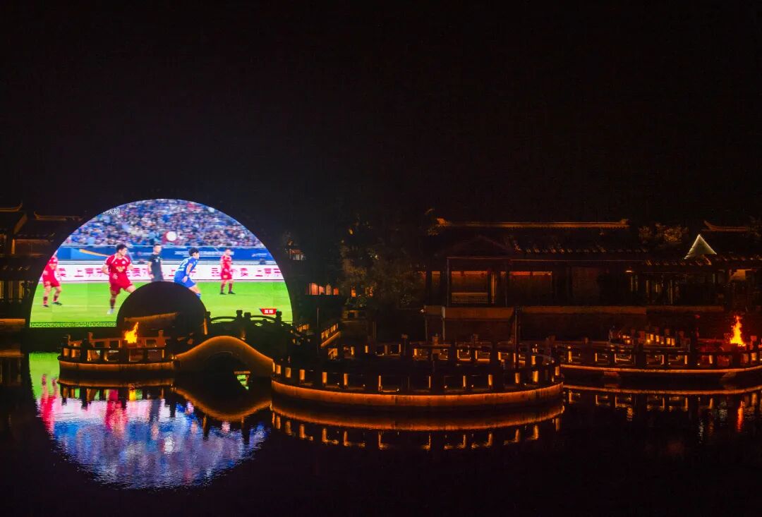 10月4日晚,游客在无锡市荡口古镇笑花池观看“苏超”南京队与连云港队的比赛。潘正光 摄