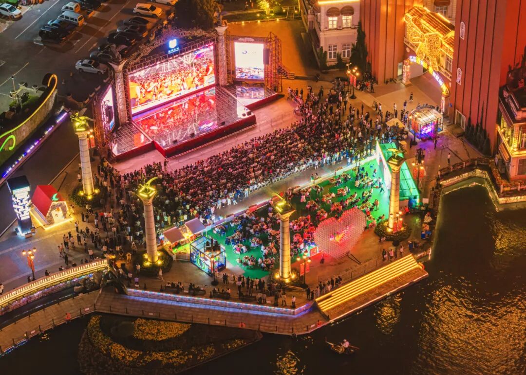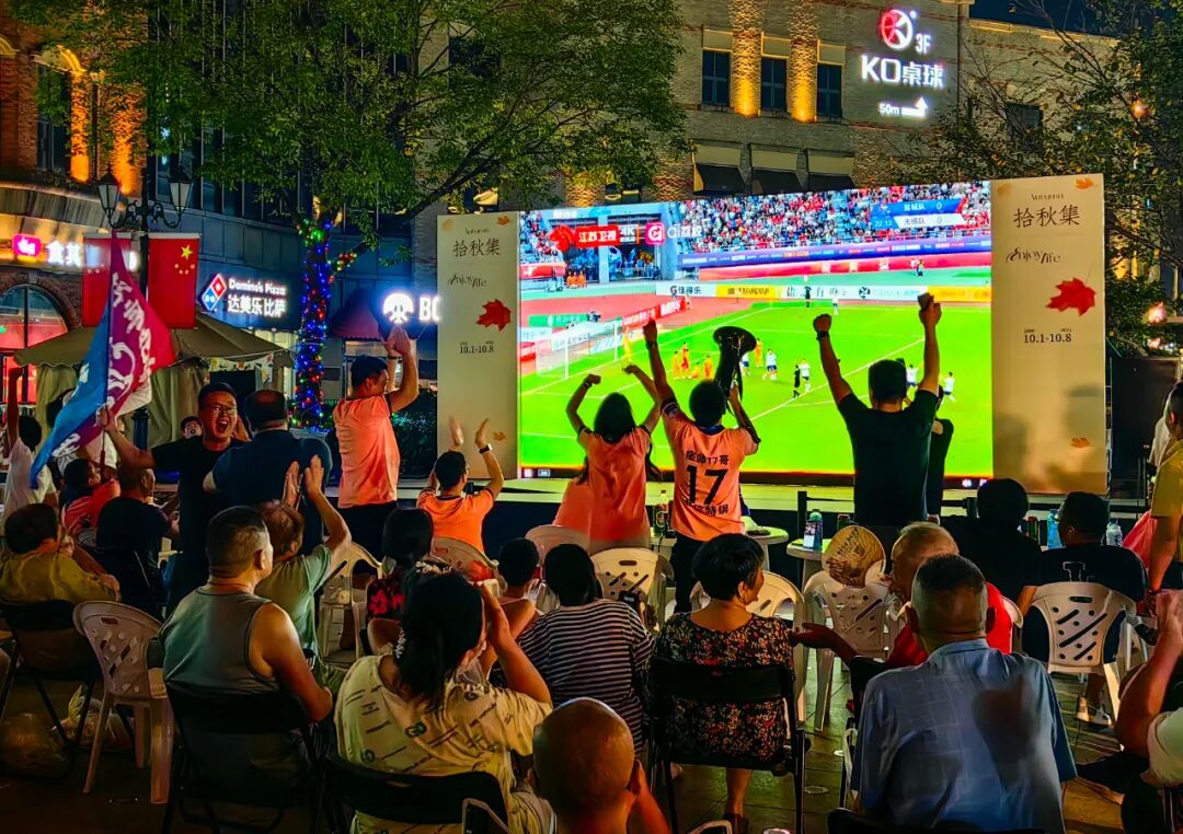 10月8日晚,“苏超”第二现场,众多市民在无锡溪南公馆广场上观球赛品美食,带动夜经济 “烟火气”。图为无锡队的第一个进球让观众们欢呼不已。钦嫣 摄