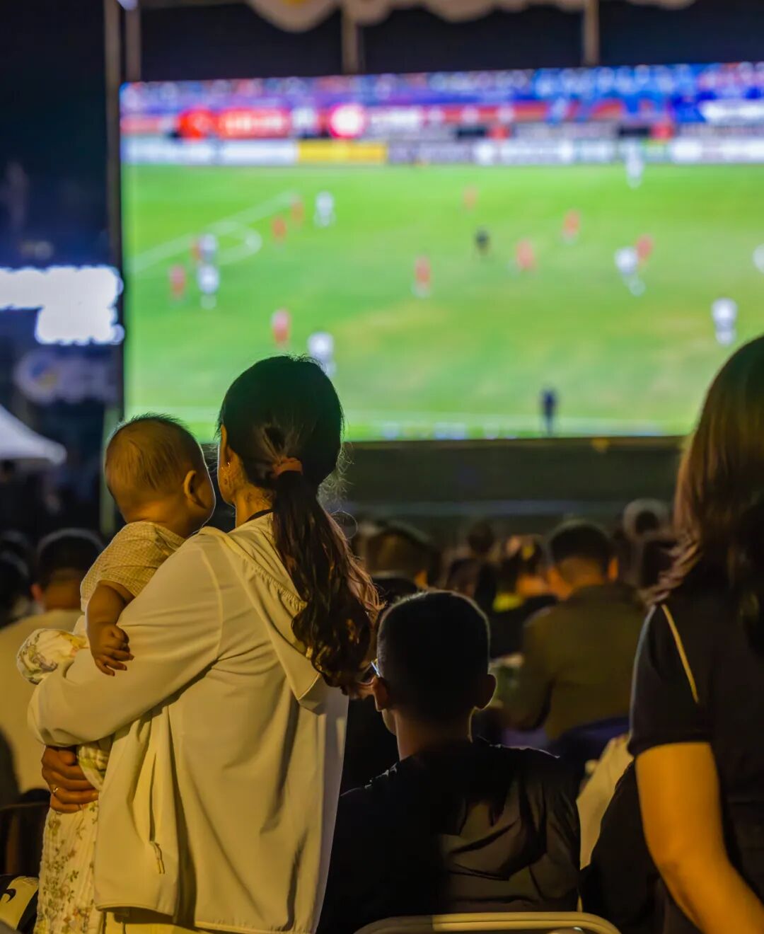 盐城盐龙体育公园第二现场,妈妈抱着婴儿观赛,现场大屏直播,观众云集。潘振群 摄