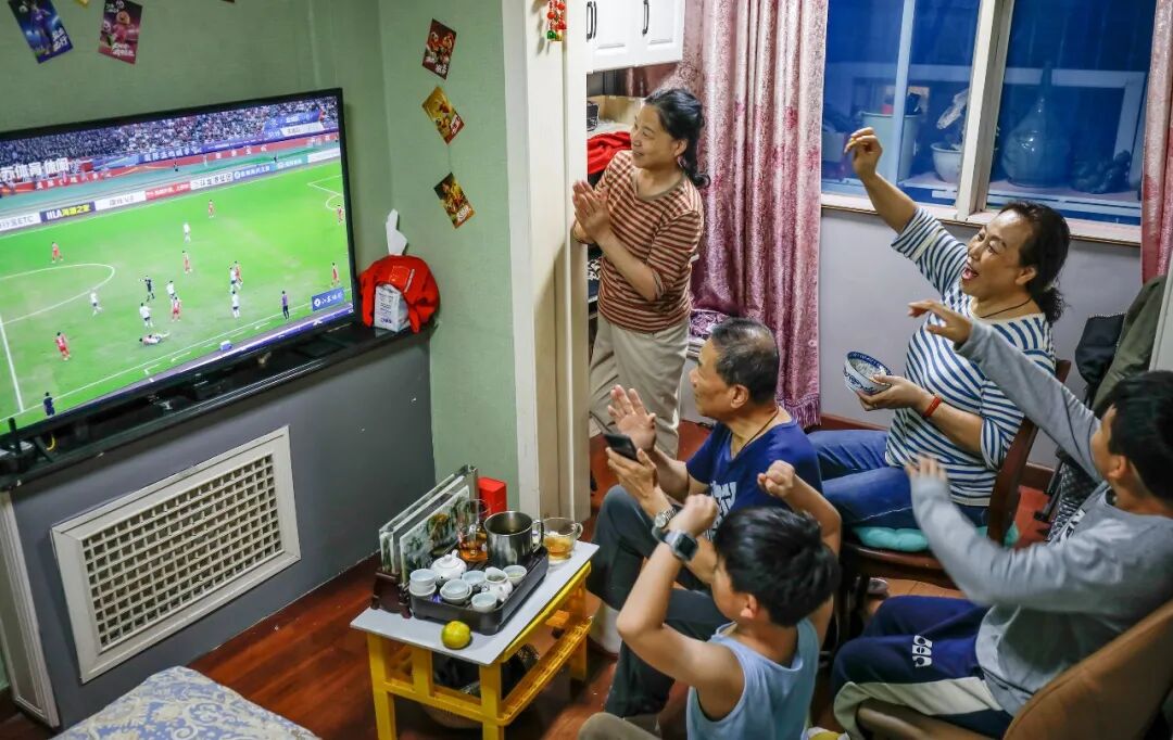 徐州丰县王沟镇,老少球迷围坐在电视前观看“苏超”淘汰赛盐城队VS无锡队的比赛实况,一家老少兴奋不已。刘立明 摄
