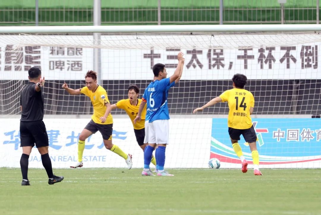 “苏超”第四轮扬州队主场迎战泰州队,图为泰州队破门瞬间。赵红伟 摄