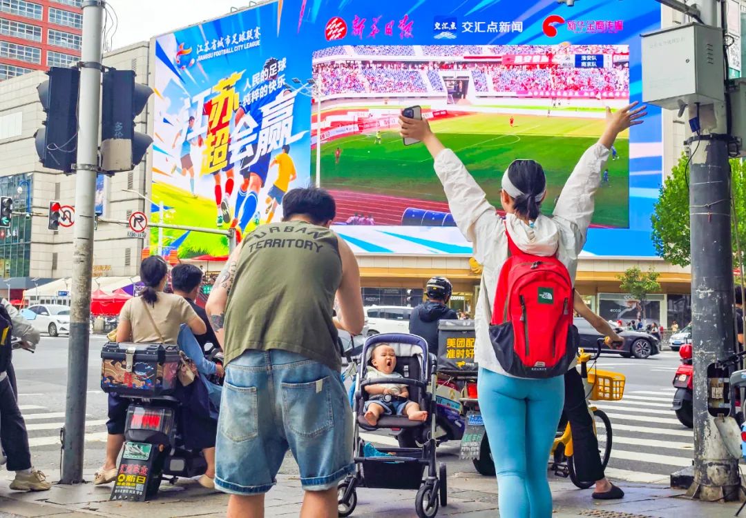 南京,新华金鹰的户外大屏正在直播“苏超”第四轮南京队客场战淮安队的比赛,让不能到场观赛的市民也能同享“苏超”快乐。张筠 摄