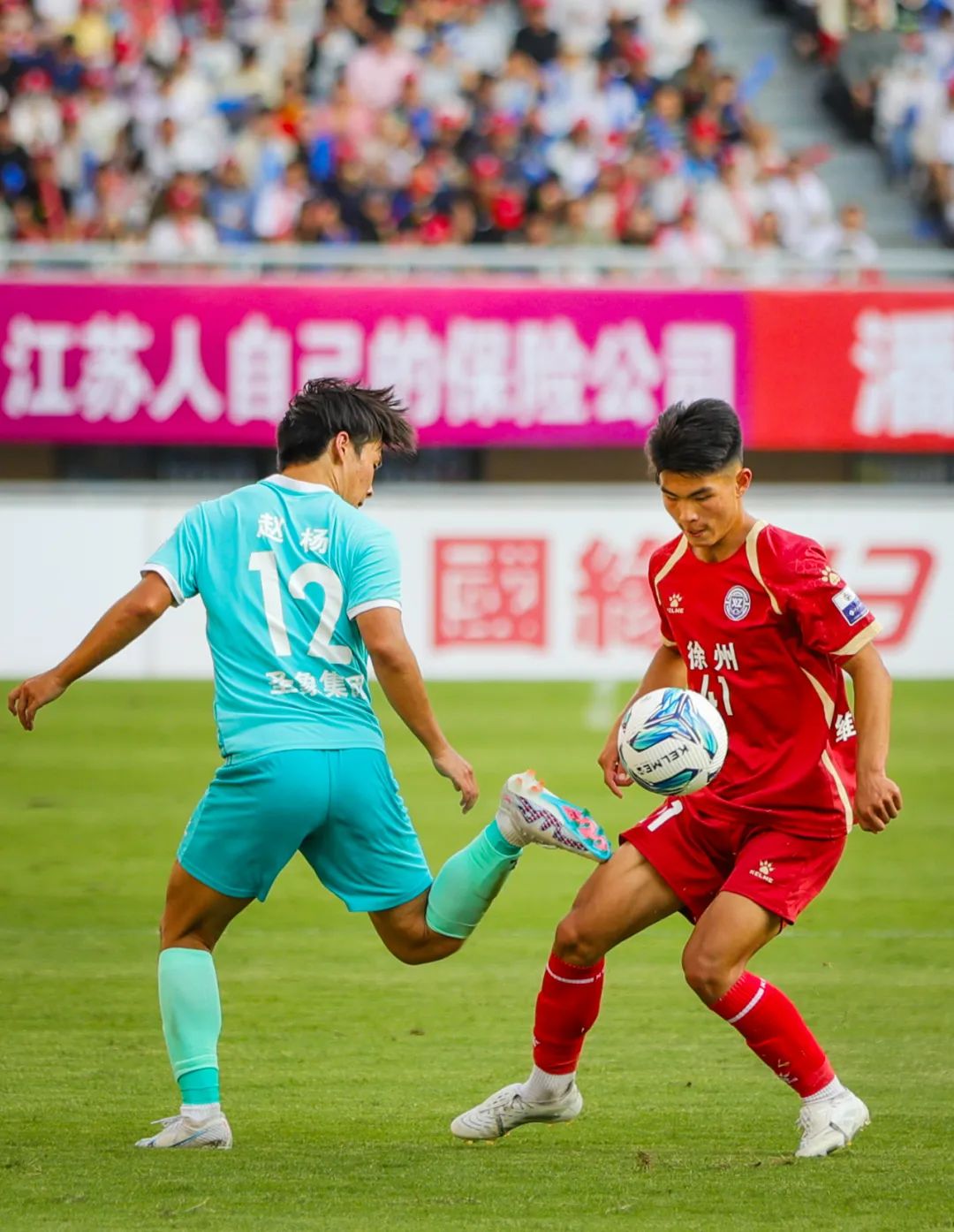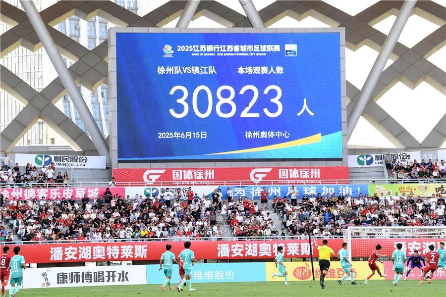 6月15日,“苏超”第四轮徐州队主场对阵镇江队的比赛在徐州市奥体中心打响。坐镇主场的徐州队打入绝杀球1比0战胜镇江队。本场比赛共有30823人来到现场为两城的比赛加油助威。万程鹏 摄