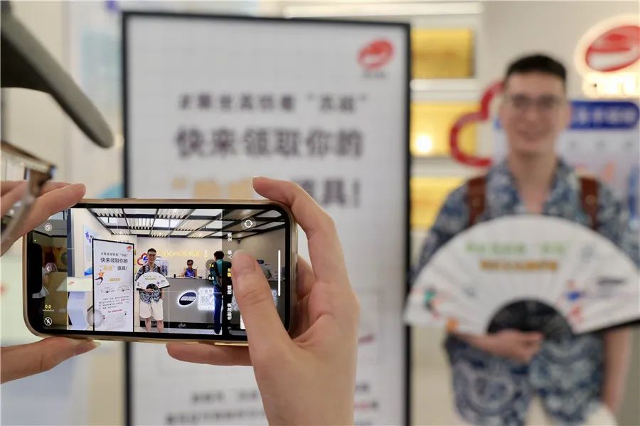 6月15日,徐州东站候车室,旅客领取“苏超”文创折扇,拍照留念。张光磊 摄