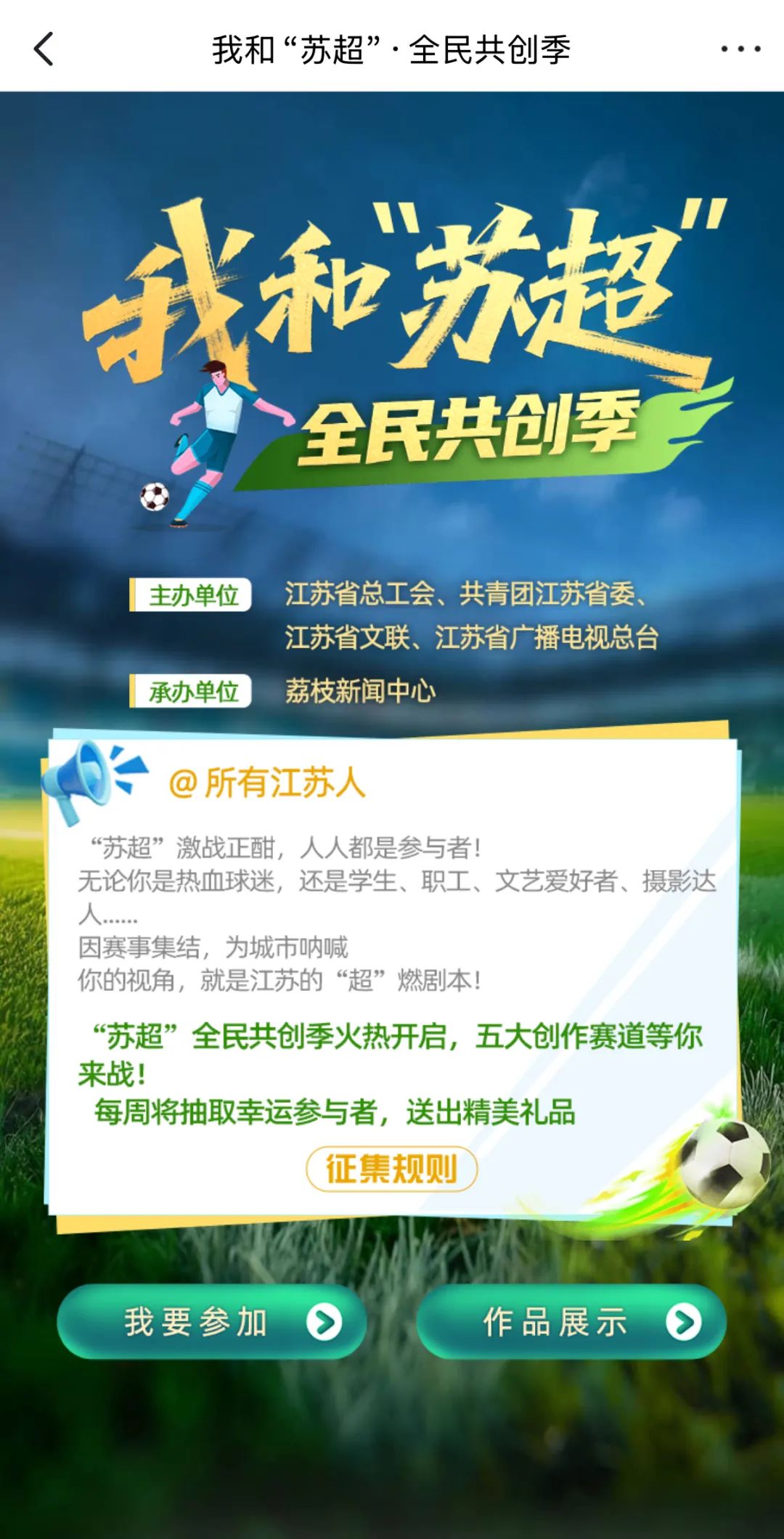《我和“苏超”·全民共创季》由江苏省总工会、共青团江苏省委、文联概况、江苏省广播电视总台联合主办,荔枝新闻中心承办。无论你是激扬文字的“笔杆子”、妙手偶得的“摄影师”,还是擅长用镜头讲故事的“导演”,我们期待你用独特的视角捕捉“苏超”的心跳与烟火气。